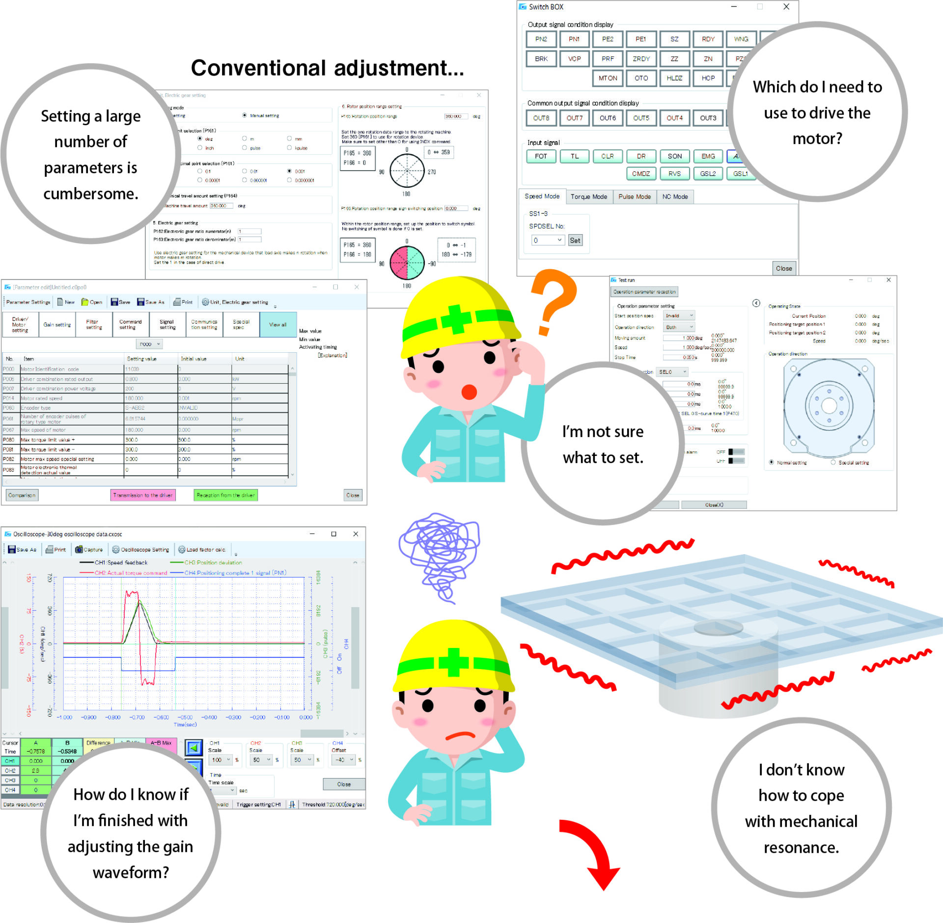 Since there are so many parameters, parameter setting is difficult. Also, auto tuning is not enough to adjust the gain, and it is necessary to adjust the gain manually.